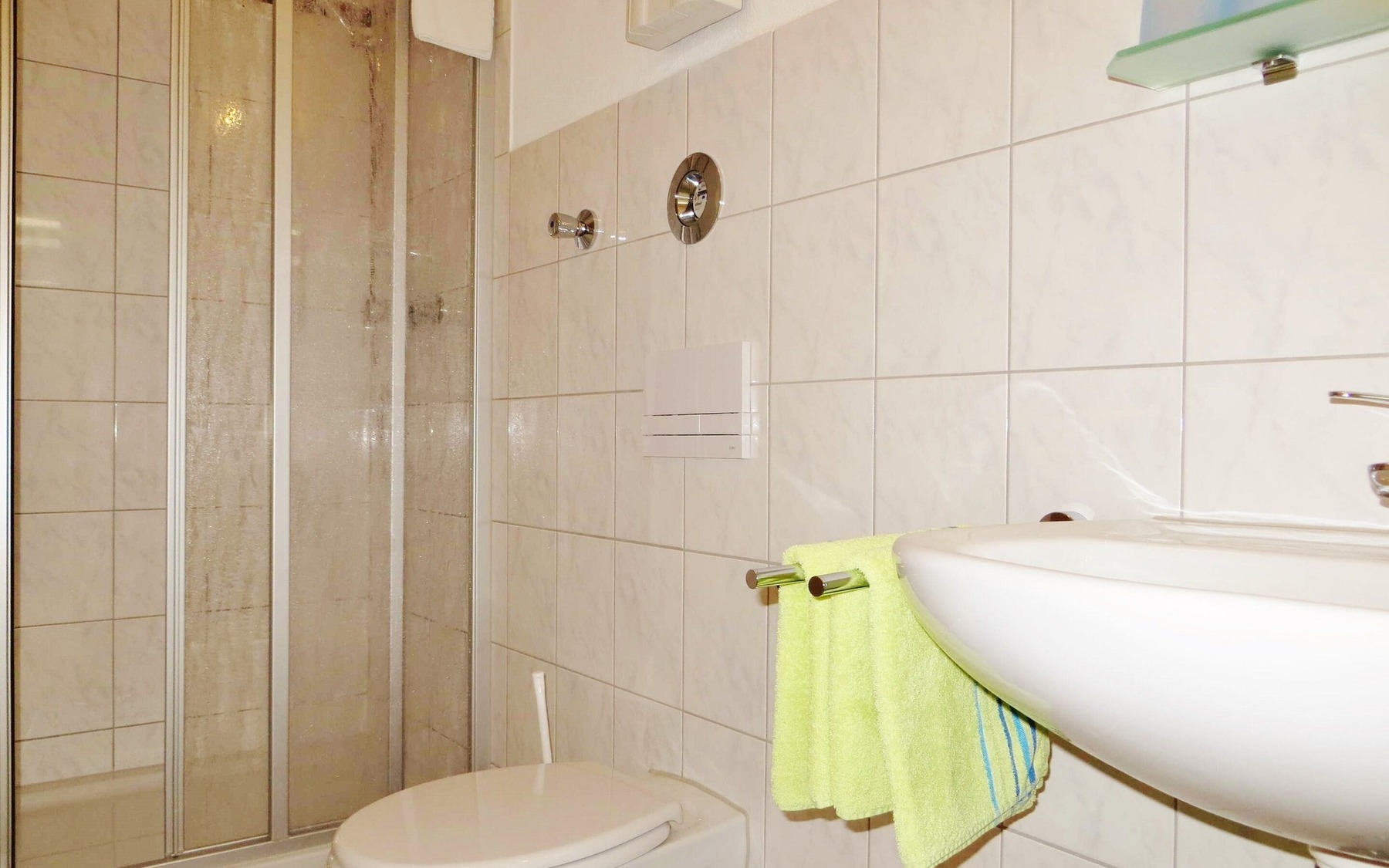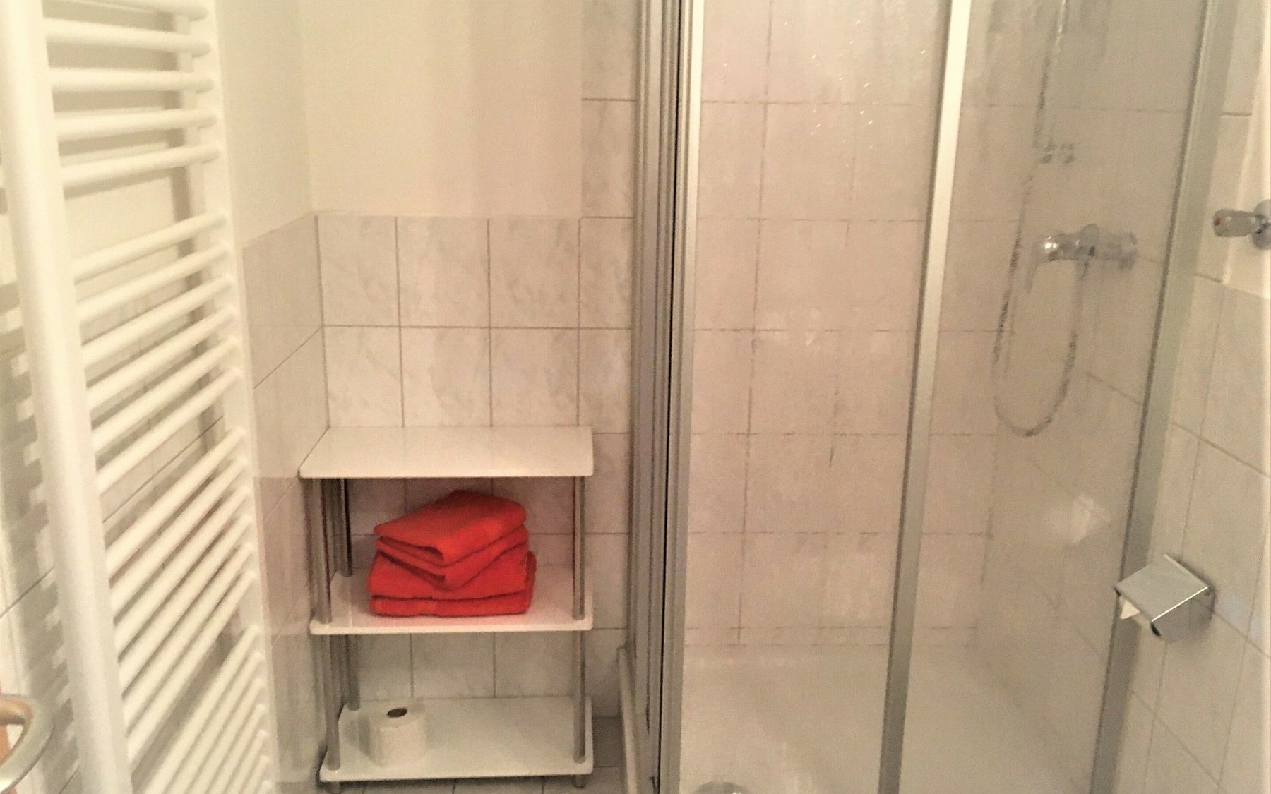 Ferienwohnung 2: Bad mit Dusche, WC , Ablagemöglichkeit, Foto: Ulrike Haselbauer, Lizenz: Foto Touristinformation Hoyerswerda