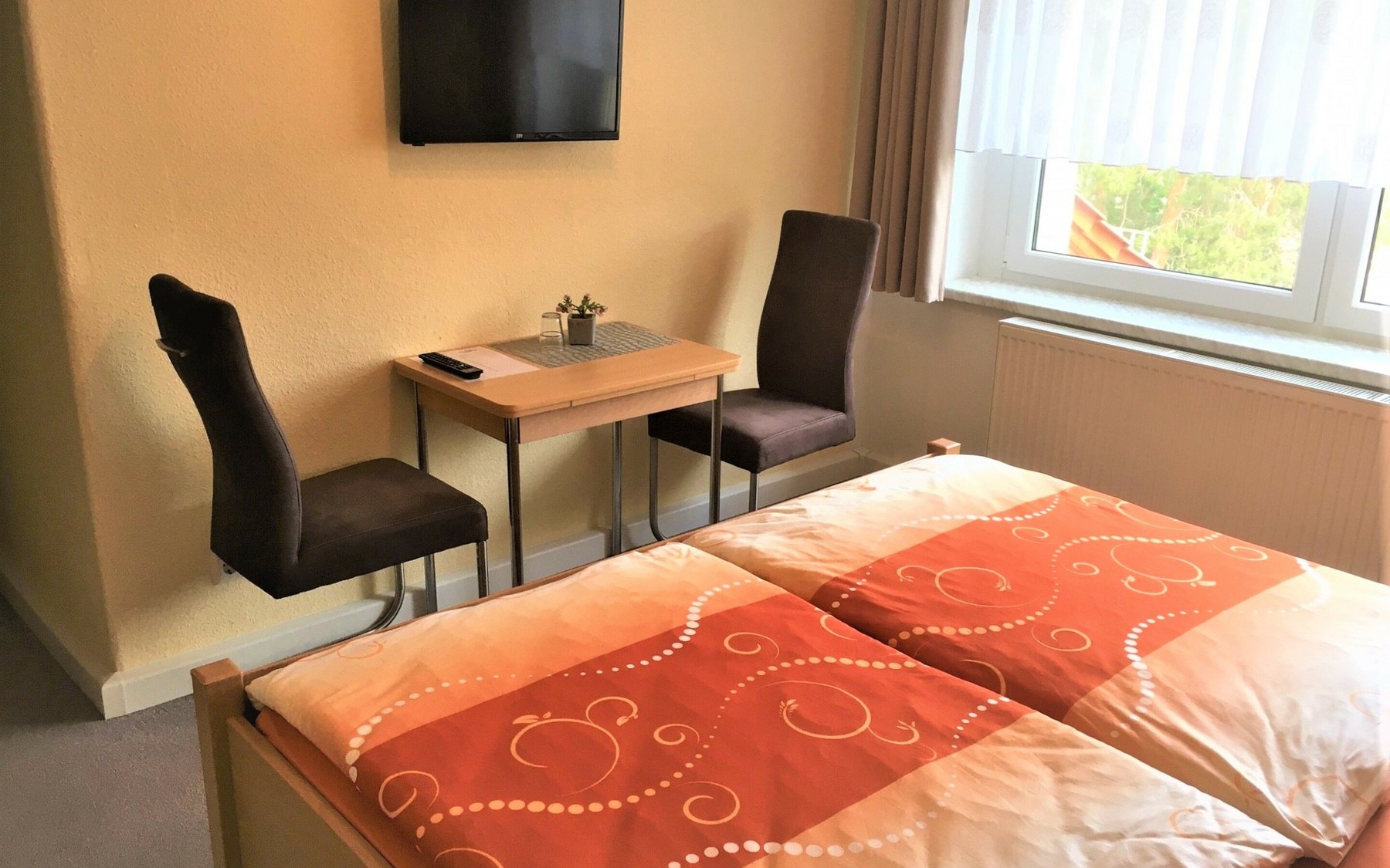 Alle Gästezimmer sind mit Bad (Dusche / WC), Fernseher und WLAN ausgestattet.